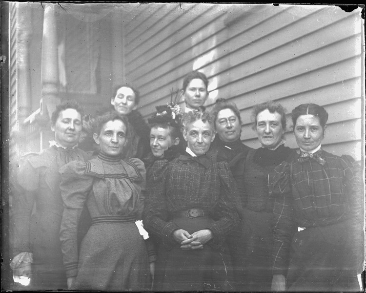 View of several women posing in front of a wooden-frame house. Handwritten on sleeve: "Unkn. people."