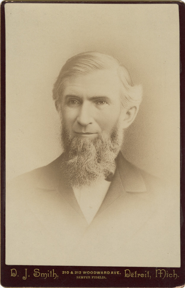 Portrait of Samuel Zug. Printed on front: "D.J. Smith, 210 & 212 Woodward Ave. Detroit, Mich. Semper fidelis." Printed on back: "D.J. Smith, art photographer. 210 & 212 Woodward Ave., Detroit, Mich." Handwritten on back: "Samuel Zug. Died Dec. 26, 1889. Born April 17, 1816."