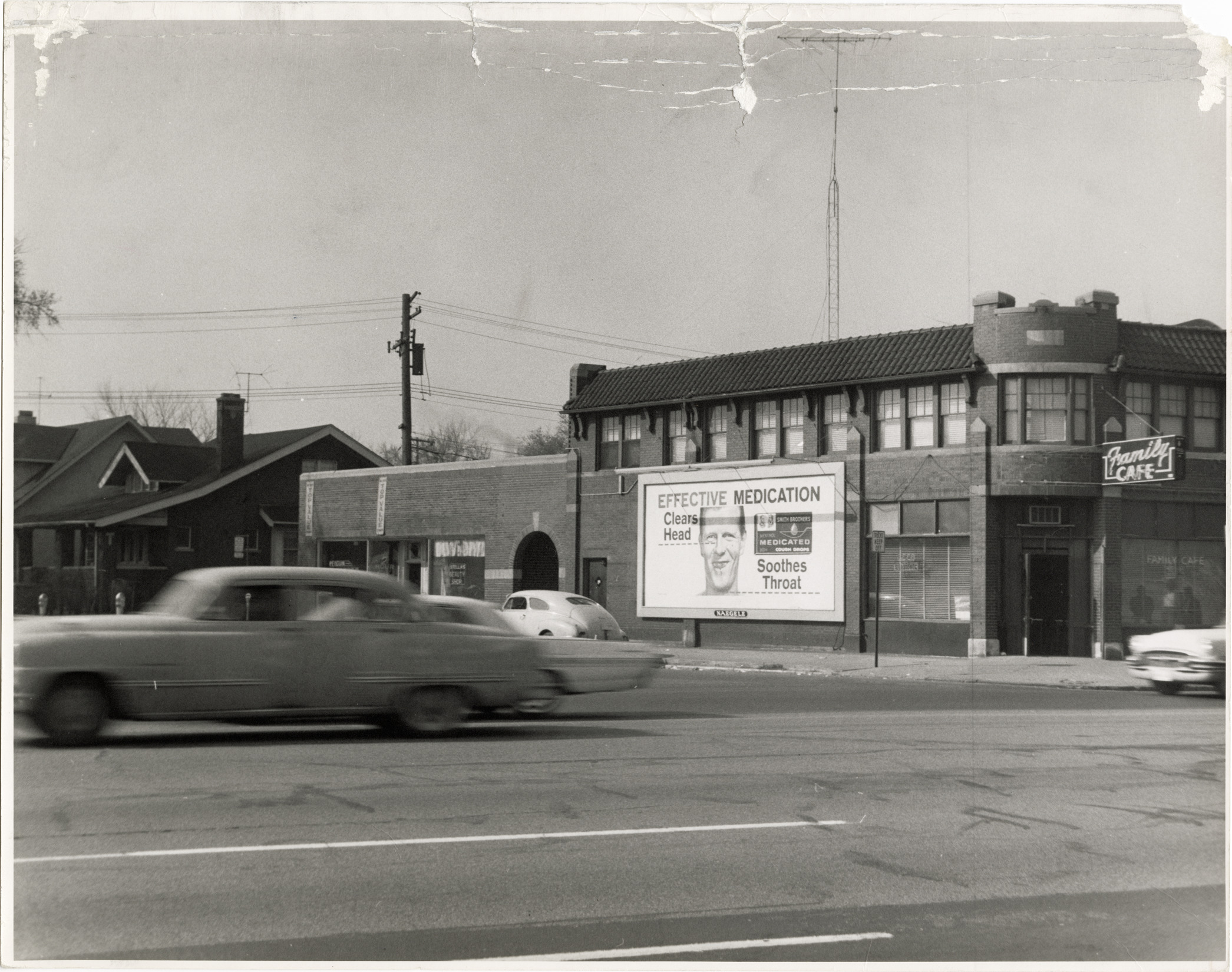 View of the Family Cafe on Jefferson Ave. Billboard advertising Smith Brothers medicated cough drops on side of building; cars in foreground. Handwritten on back: "Jefferson."