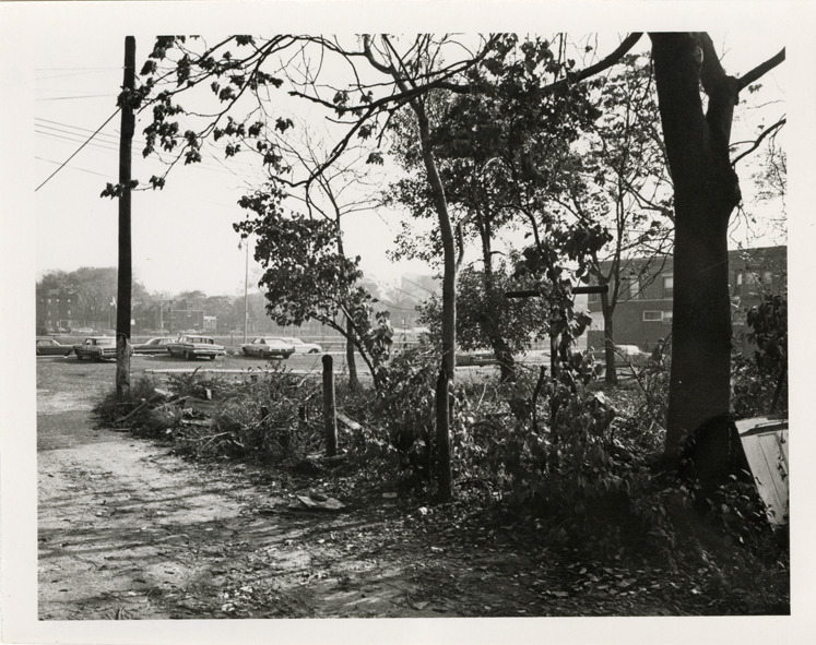View of cars on a vacant lot at northwest corner of Delaware and the John Lodge expressway. Stamped on back: "Photography by D. Bruce Banta, Detroit." Handwritten on back: "#61, NW corner Delaware & John Lodge, 2 vacant lots, back."