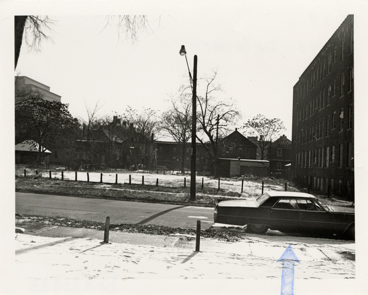 View of a vacant lot located at 1393 Delaware. Apartment building on right. Automobile parked in street; houses in background. Blue arrow indicates property. Stamped on back: "Photography by D. Bruce Banta, Detroit." Handwritten on back: "#37, 1393 Delaware."