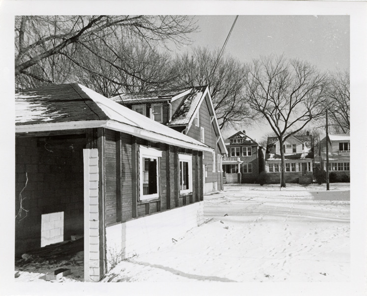 Favorite this☆ Vacant lot at 607 Drexel Description: Rear view of a snow-covered vacant lot located at 607 Drexel. Garage in foreground; houses in background. Stamped on back: "Photography by D. Bruce Banta, Detroit." Handwritten on back: "#211, 607 Drexel." Details Resource ID: bh023052 Creator: Banta, D. Bruce Subject: Vacant lands--Michigan--Detroit Wooden-frame houses--Michigan--Detroit Garages--Michigan--Detroit Detroit Housing Commission--Archives Photographers--Michigan--Detroit Photographic prints Date Issued: Unknown year Format: 1 photographic print ; 4 x 5 in. Member of: Burton Historical Collection Filing Location: MS/Detroit Archives. Housing Commission. Drexel, photographs. 142:5 Rights: Physical rights are retained by DPL. Copyright is retained in accordance with U.S. copyright laws.