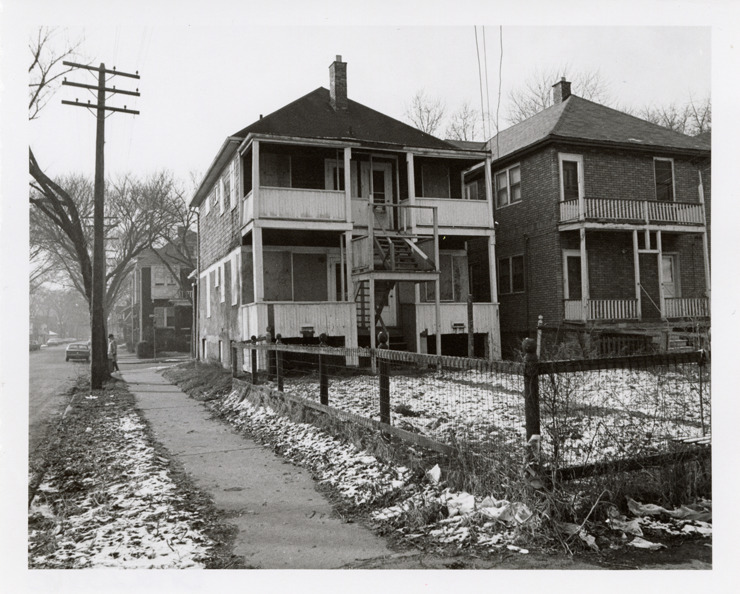 Rear view of an abandoned two-story duplex located at 702 Eastlawn. Stamped on back: "Photography by D. Bruce Banta, Detroit." Handwritten on back: "#226, 702 Eastlawn."