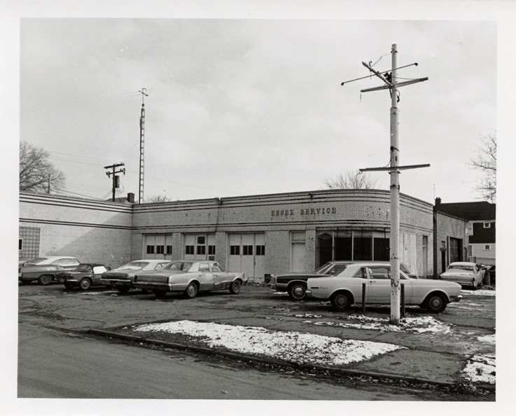 View of an abandoned brick car repair shop located at 14100 Essex. Sign on building reads: "Essex Service." Abandoned cars parked in front of building. Stamped on back: "Photography by D. Bruce Banta, Detroit." Handwritten on back: "#229, 14100 Essex."
