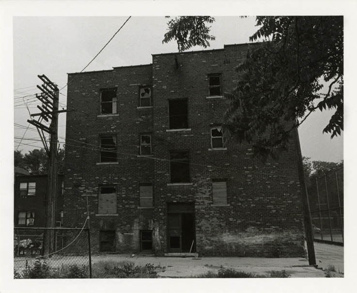 Rear view of an abandoned brick apartment building located at 1994 S. LaSalle Gardens. Stamped on back: "Photography by D. Bruce Banta, Detroit." Handwritten on back: "#143-A, 1994 S. LaSalle Gardens."