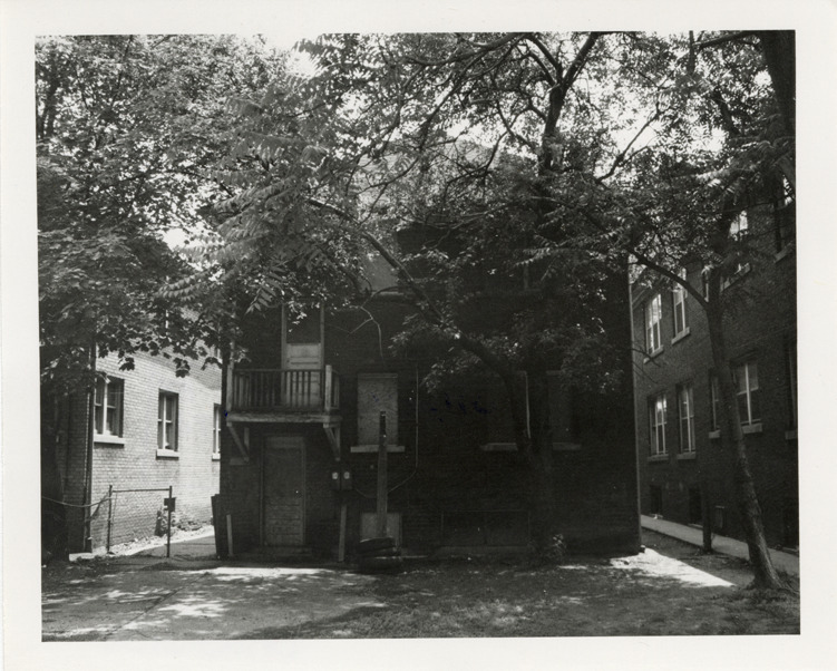 Rear view of a two-story brick house, possibly a duplex, located at 2030 Philadelphia. Stamped on back: "Photography by D. Bruce Banta, Detroit." Handwritten on back: "#126, 2030 Philadelphia."
