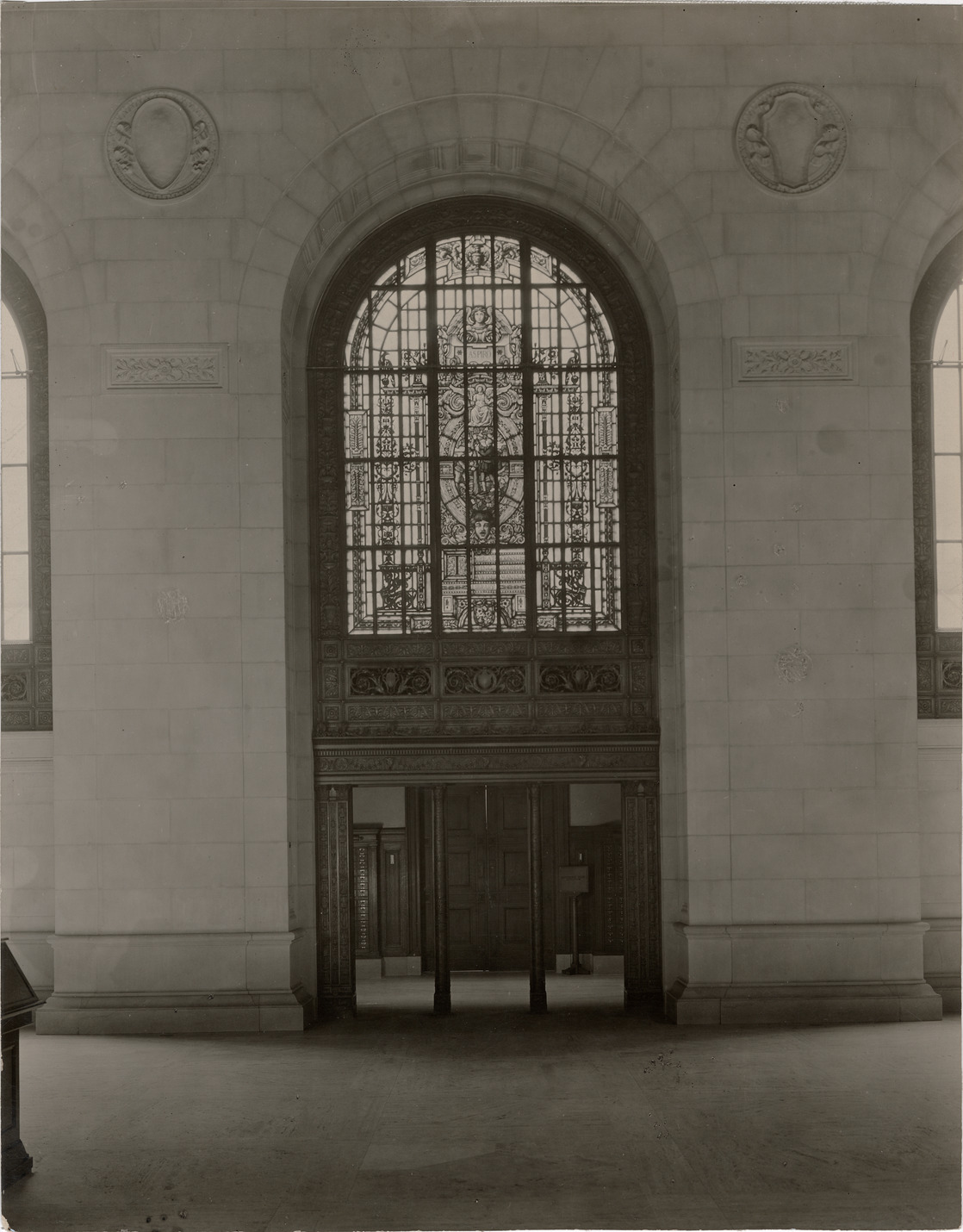 View of stained glass window over doorway in Adam Strohm Hall, on the third floor of the Main Library, Detroit Public Library. Stamped on back: "L.S. Glover, commercial photographer, 7449 Hanover Ave., Detroit." Typed on back: "Detroit Public Library, Window over entrance to public catalog."
