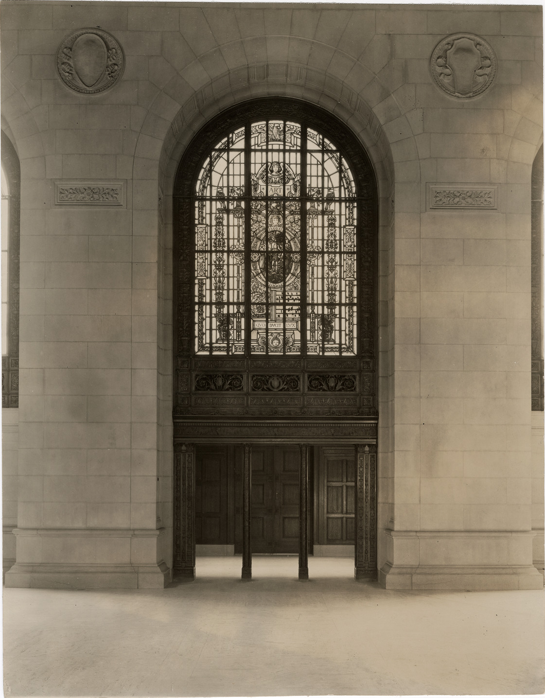View of stained glass window over doorway in Adam Strohm Hall, on the third floor of the Main Library, Detroit Public Library. Stamped on back: "L.S. Glover, commercial photographer, 7449 Hanover Ave., Detroit." Typed on back: "Detroit Public Library, Window over entrance to Open Shelf Room."