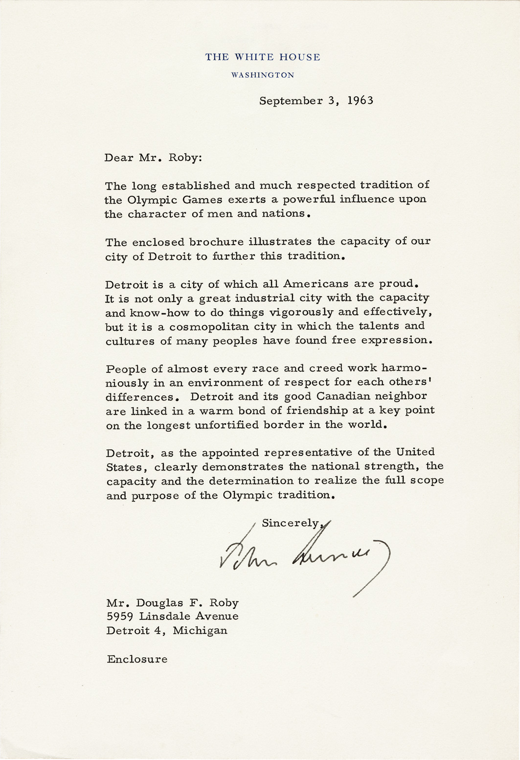 Letter from President John F. Kennedy to Douglas F. Roby, President of the U.S. Olympic Committee, recommending the city of Detroit as a potential venue for the XIX Olympiad. This letter was included in the booklet "Detroit, 1968. An invitation to the International Olympic Committee to celebrate the XIX Olympiad at Detroit, Michigan, U.S.A."