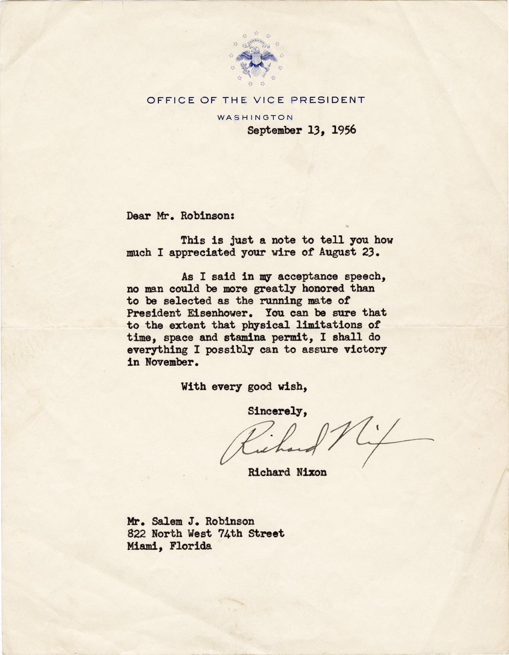 Letter from Vice-President Richard M. Nixon to Salem J. Robinson, thanking him for his congratulatory wire. Nixon indicates that he is honored to be selected as the running mate of President Dwight Eisenhower.