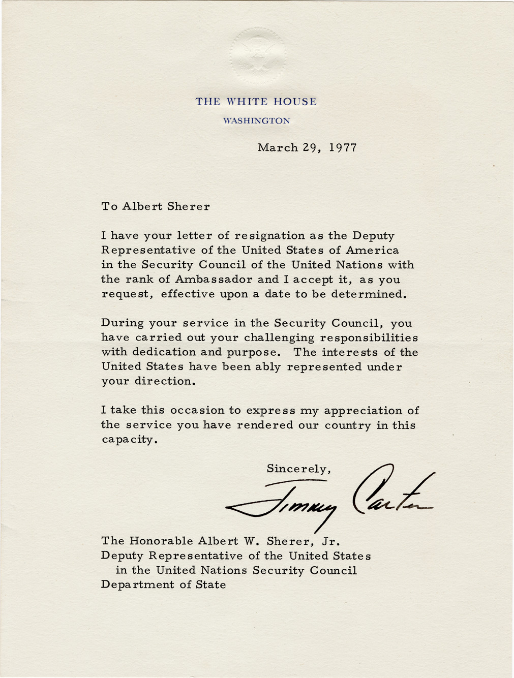 Favorite this☆ Letter from Jimmy Carter to Albert W. Sherer, Jr. Description: Letter from President Jimmy Carter to Albert W. Sherer, Jr., accepting his resignation as Deputy Representative of the United States of America in the Security Council of the United Nations. Details Resource ID: bh023214 Creator: Carter, Jimmy, 1924- Subject: Carter, Jimmy, 1924--Correspondence Sherer, Albert W.--Correspondence United Nations. Security Council Presidents--United States Date Issued: 1977-03-29 Format: 1 sheet ; 9 x 6.75 in. Member of: Rare Book Collection Filing Location: XR 091 U583b Rights: Physical rights are retained by DPL. Copyright is retained in accordance with U.S. copyright laws.