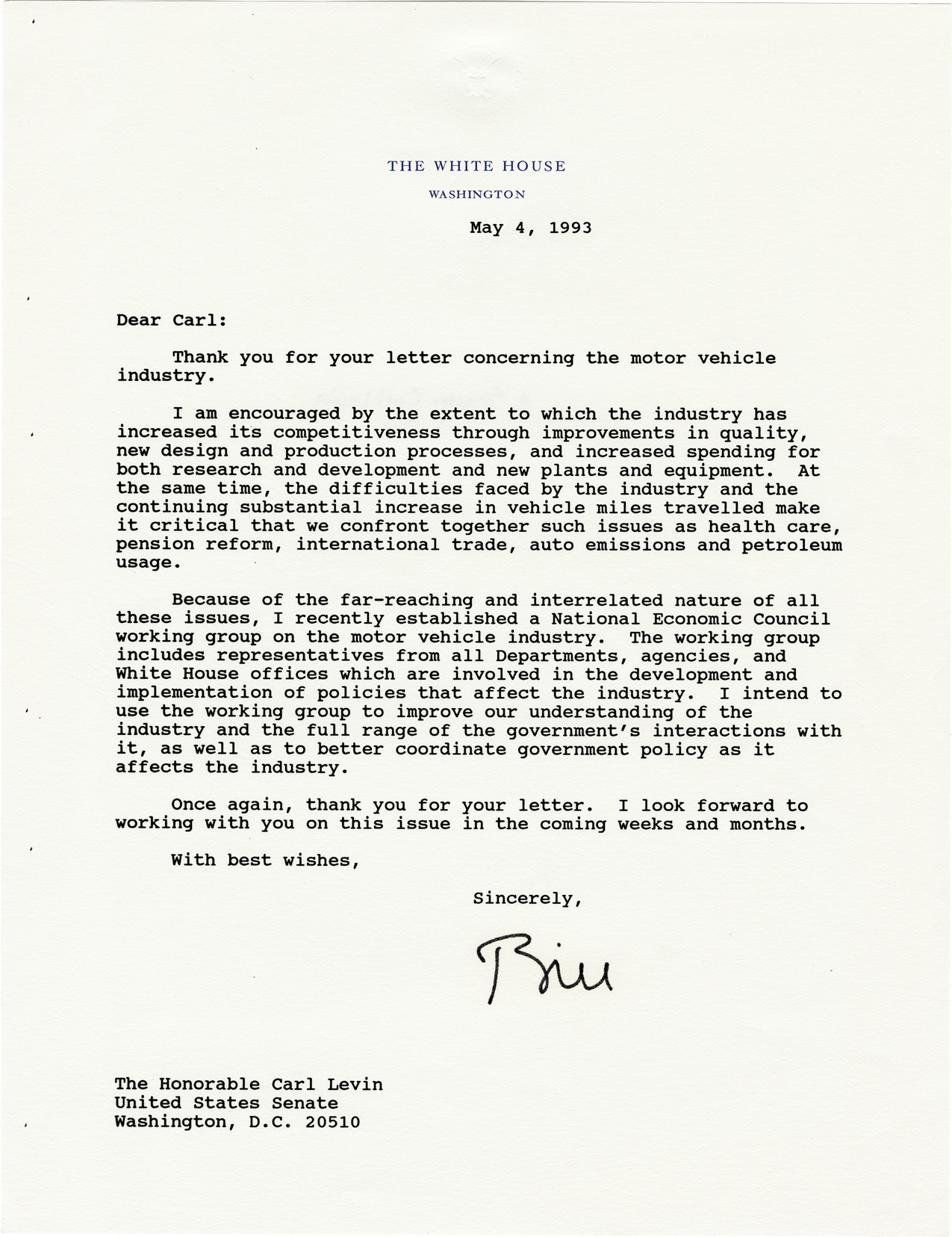 Favorite this☆ Letter from Bill Clinton to Carl Levin Description: Letter from President Bill Clinton to U.S. Senator Carl Levin, thanking him for his correspondence and discussing the establishment of a National Economic Council working group on the motor vehicle industry. Details Resource ID: bh023218 Creator: Clinton, Bill, 1946- Subject: Clinton, Bill, 1946--Correspondence Levin, Carl, 1934--Correspondence Presidents--United States National Economic Council (U.S.) Automobile industry and trade--United States Date Issued: 1993-05-04 Format: 1 sheet ; 11 x 8.5 in. Member of: Rare Book Collection Filing Location: XR 091 U583b Rights: Physical rights are retained by DPL. Copyright is retained in accordance with U.S. copyright laws.