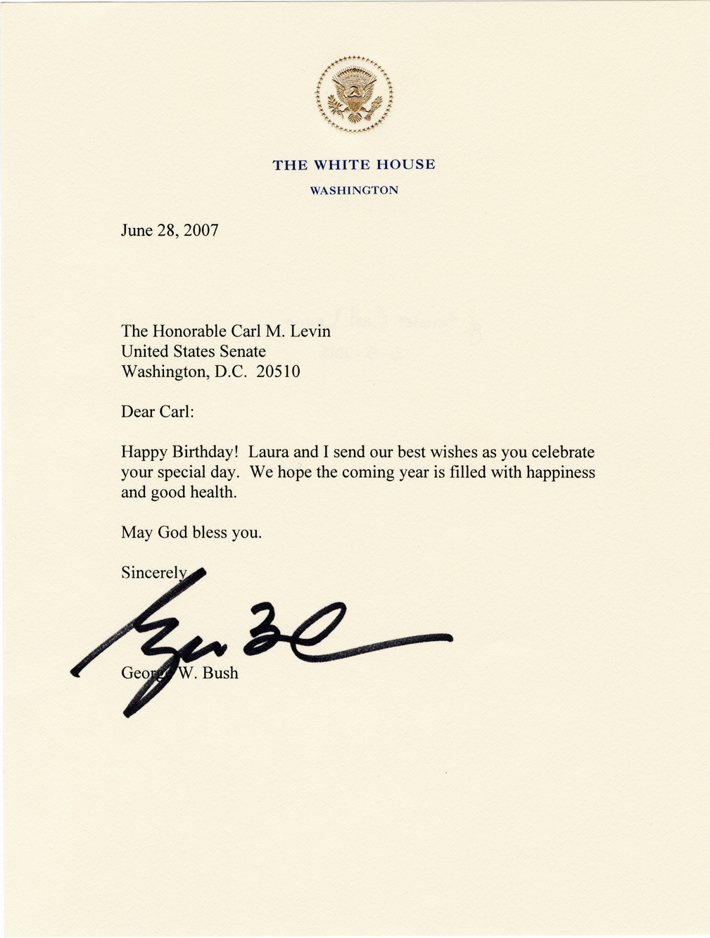 Favorite this☆ Letter from George W. Bush to Carl Levin Description: Letter from President George W. Bush to U.S. Senator Carl Levin, wishing him a happy birthday. Details Resource ID: bh023219 Creator: Bush, George W., 1824-1900 Subject: Bush, George W., 1824-1900--Correspondence Levin, Carl, 1934--Correspondence Presidents--United States Date Issued: 2007-06-28 Format: 1 sheet ; 9 x 6.75 in. Member of: Rare Book Collection Filing Location: XR 091 U583b Rights: Physical rights are retained by DPL. Copyright is retained in accordance with U.S. copyright laws.