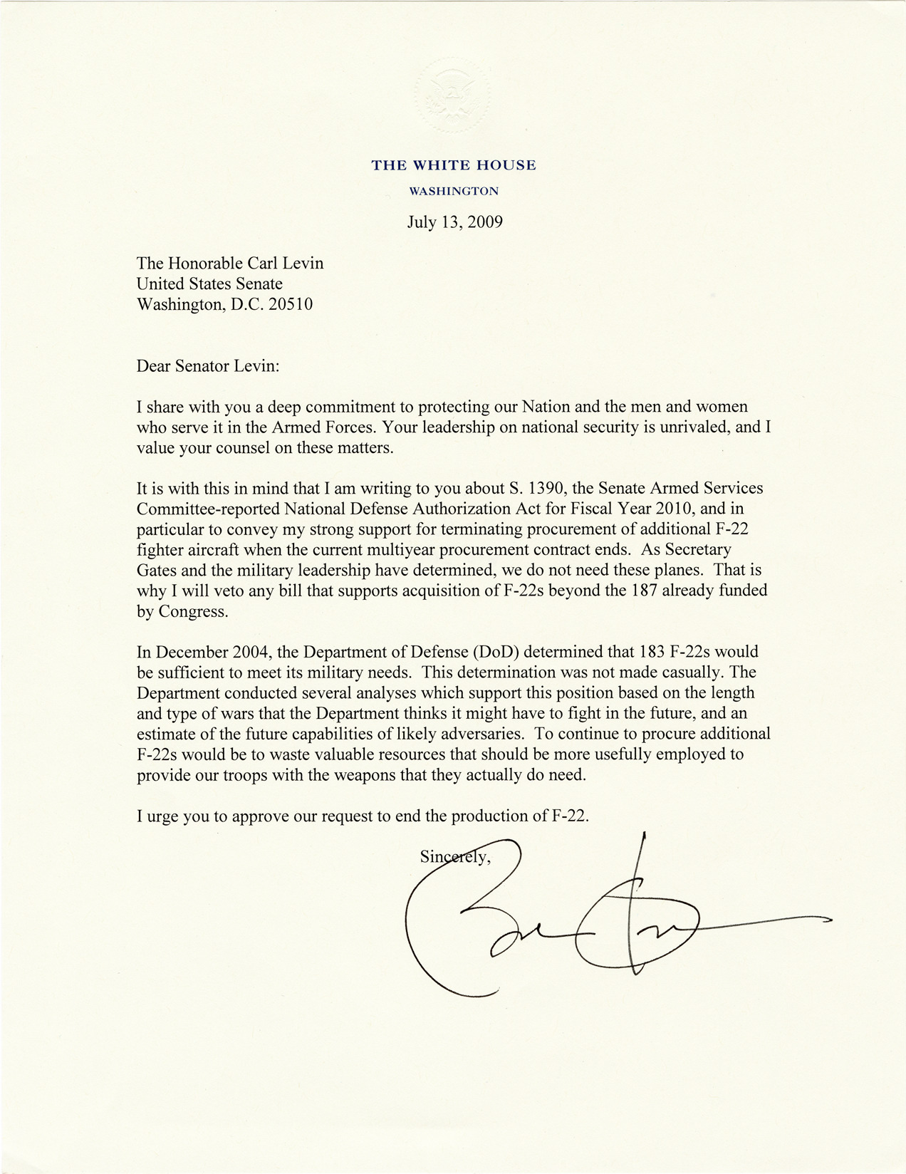 Letter from President Barack Obama to U.S. Senator Carl Levin regarding S. 1390, the Senate Armed Services Committee-reported National Defense Authorization Act for fiscal year 2010. President Obama urges Senator Levin to approve his request to end production of the F-22 fighter aircraft.