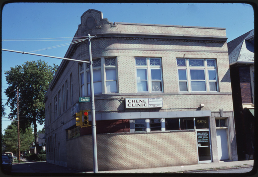 View of the Chene Clinic located at 5470 Chene. Sign on two-story brick building reads: "Chene Clinic. Dr. Perry Mathis, physician. Dr. John M. Smith, dentist." Handwritten on slide mount: "5470 Chene."