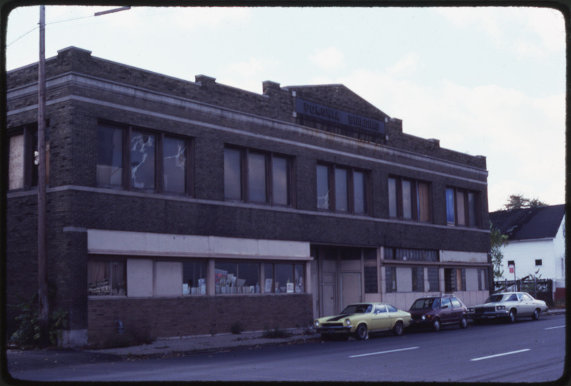 View of Polonia Building located on Forest near Chene. Cars are parked in street. Handwritten on mount: "Polonia Bldg. S. side of Forest near Chene. An old Polish newspaper bldg."