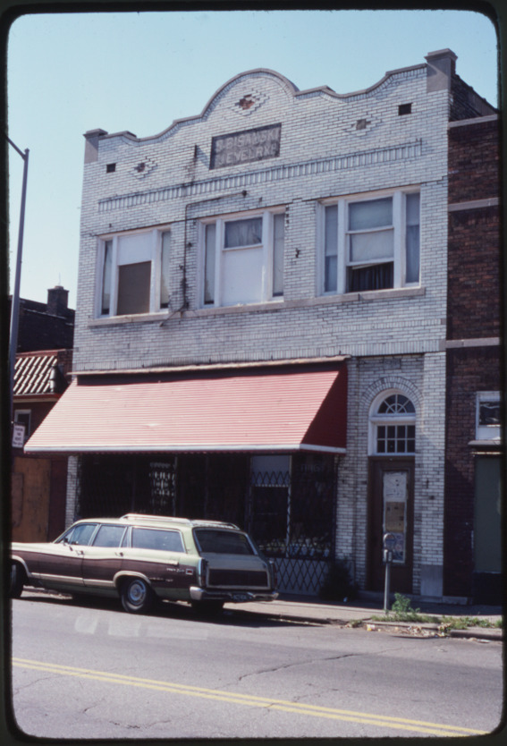 View of a two-story, brick commercial building with awning located at 5347 Chene. "S. Bisamski, Jevelrke" inscribed on building; station wagon parked in street. Handwritten on mount: "Bookstore. 5347 Chene."