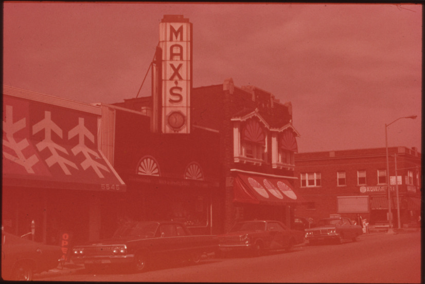 View of Max's Jewelry store, located at 5553 Chene, and other businesses. Cars are parked in street. Handwritten on mount: "Max's Jewelry."