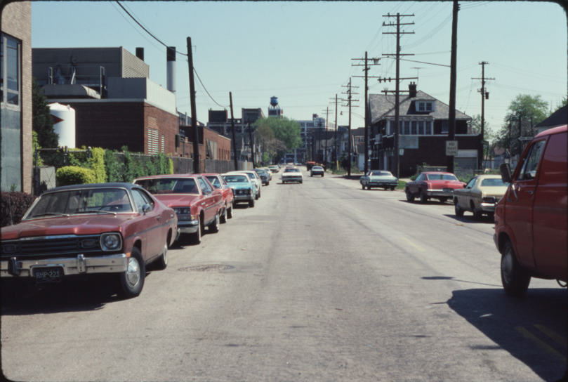 View of cars parked on Milwaukee Ave., looking east from East Grand Boulevard. Handwritten on mount: "Milwaukee Ave., looking east from E. Gd. Blvd."