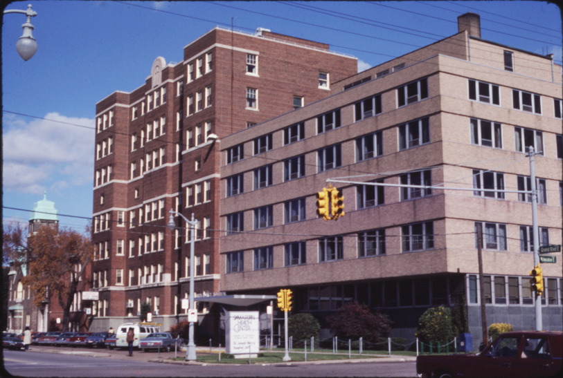 View of St. Joseph Hospital on the corner of E. Grand Blvd. and Milwaukee. Handwritten on mount: "St. Joseph Hospital, cor. E. Gd. Blvd. & Milwaukee."