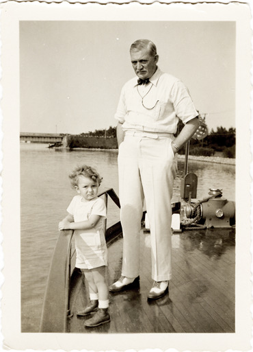 View of William S. Knudsen posing with W.R. VanderKloot on the deck of the Naiad at Grosse Ile. Handwritten on back: "Father & Bill on Niade [sic], 1938? at Grosse Ile. Big Bill - William S. Knudsen. Little Bill - William Robert VanderKloot."