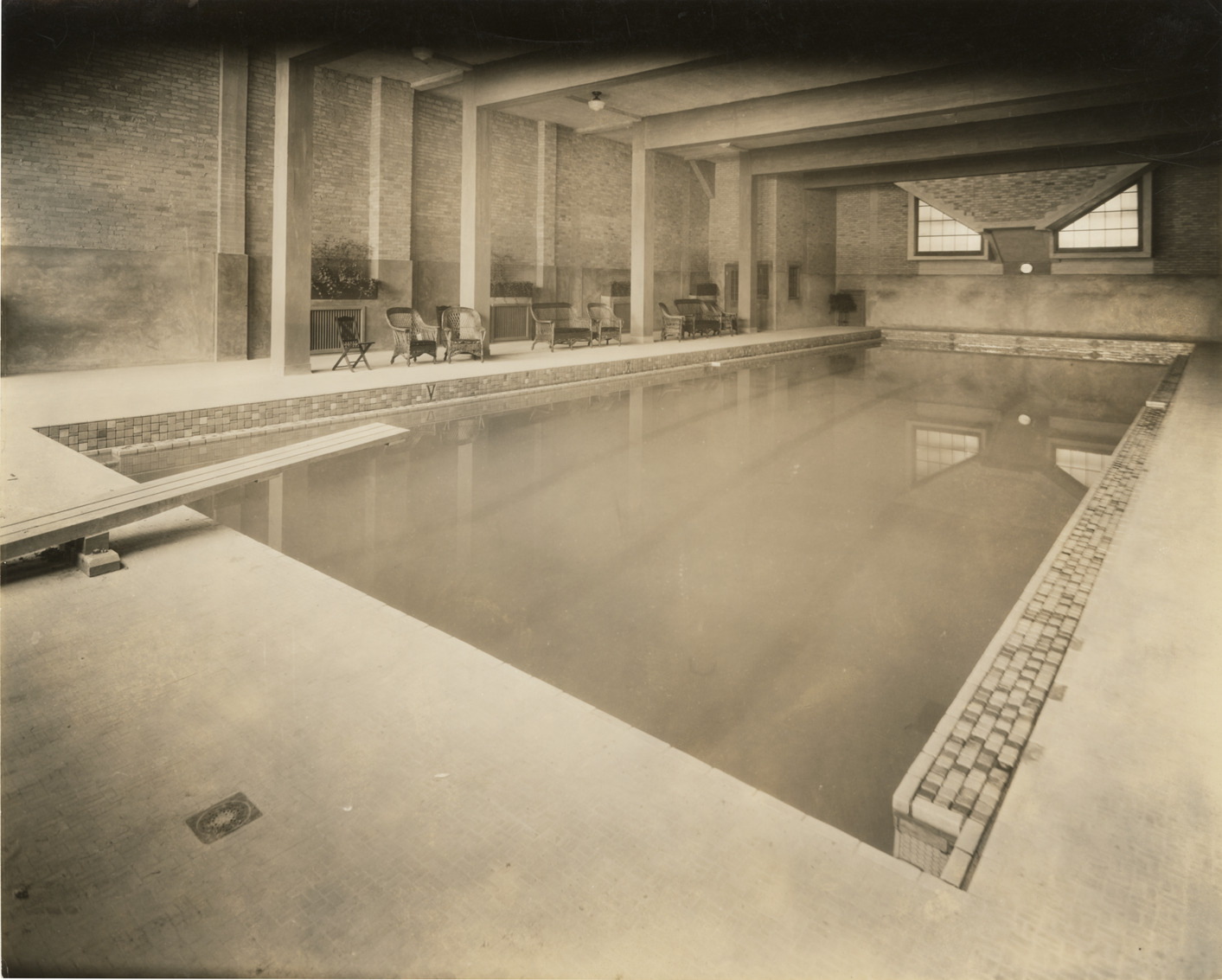 View of indoor swimming pool at the Women's City Club of Detroit. Wicker furniture at edge of pool. Stamped on back: "Manning Bros., commercial photographers. 504-505 Lincoln Building. Corner State and Park Sts., Detroit, Mich." Handwritten on back: "Swimming pool, new Women's City Club."