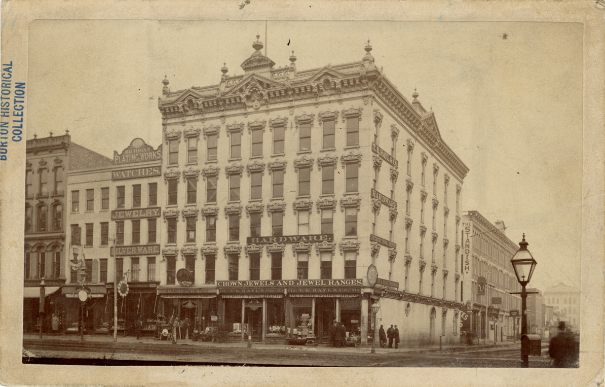 Favorite this☆ T.B. Rayl & Co. hardware store Description: View of T.B. Rayl & Co. hardware store on Woodward Ave., at the corner of Congress. Stamped on back: "Farmer Bros., photographers, Detroit, Mich." Handwritten on back: "Rayl, T.B. & Co. NE cor. Woodward Ave. & Congress St., 1883." Details Resource ID: bh023416 Creator: Farmer Brothers Subject: Hardware stores--Michigan--Detroit Woodward Avenue (Mich.) Photographers--Michigan--Detroit Photographic prints Date Issued: 1883 Format: 1 photographic print mounted on mat board ; image 4.5 x 7.5 in. Member of: Burton Historical Collection Filing Location: D/Industries and business houses-Rayl, T.B. Rights: Physical rights are retained by DPL. Copyright is retained in accordance with U.S. copyright laws.