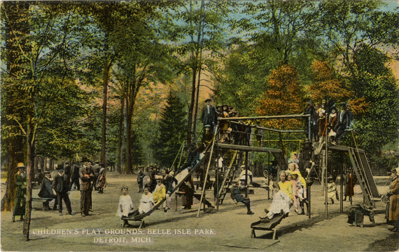 View of children in playground on Belle Isle. Slides in foreground. Printed on front: "Children's play grounds, Belle Isle Park, Detroit, Mich." Printed on back: "Children's play grounds, Belle Isle Park, Detroit, Mich. Belle Isle is in the Detroit River, between Detroit and Windsor, Canada. The island contains 702 acres and is entirely covered with one of the most beautiful parks in the United States, having some 21 miles of macadam roads, a magnificent casino, pavilions, boat house, aquarium, horticultural hall and zoological gardens. The island was purchased by Detroit in 1879. Since then $1,600,000 has been expended in beautifying it. C.T. Photochrom."