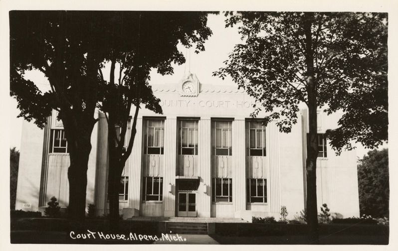 Favorite this☆ Courthouse, Alpena, Michigan Description: View of the courthouse in Alpena, Michigan. Printed on front: "Court House, Alpena, Mich." Details Resource ID: bh023442 Subject: Courthouses--Michigan--Alpena Photographic prints Postcards Date Issued: Unknown year Format: 1 postcard ; 3.5 x 5.5 in. Member of: Burton Historical Collection Filing Location: M/Localities-Alpena Rights: Physical rights are retained by DPL. Copyright is retained in accordance with U.S. copyright laws.
