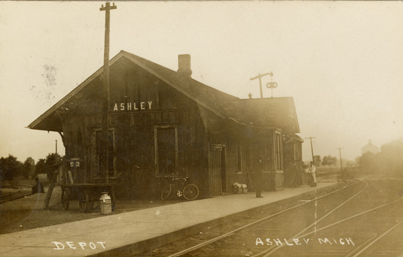View of the train station at Ashley, Michigan. Printed on front: "Depot, Ashley, Mich." Handwritten on back: "Ashley, Mich. Oct. 17, 1910. Friend Ora, I will write you a card to let you know I'm well. Hope you the same. Ed. and I are working very hard now. I thank you ever so much for the birthday card you sent me. I get mail at Ashley in care of Fred Erickson. Your friend, Henry Sower." Card is postmarked October 18, 1910.