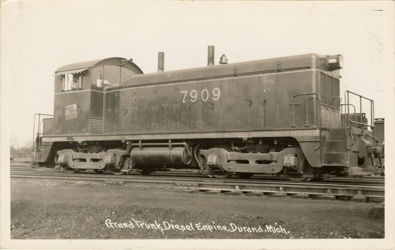 View of a Grand Trunk Western Railroad diesel locomotive at Durand, Michigan. Printed on front: "Grand Trunk diesel engine, Durand, Mich."