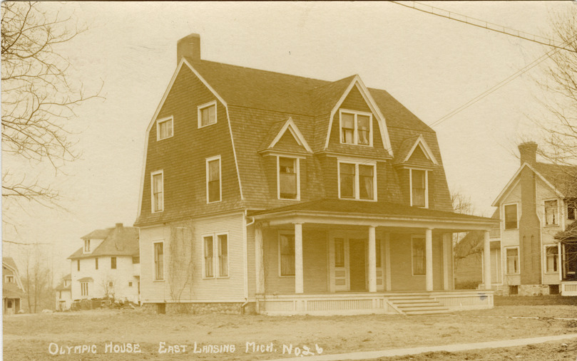 Favorite this☆ Olympic House, East Lansing, Michigan Description: View of the Olympic House in East Lansing, Michigan. Wooden-frame house has gambrel roof and covered entry porch. Printed on front: "Olympic House, East Lansing, Mich. No. 26." Details Resource ID: bh023497 Subject: Greek letter societies--Michigan--East Lansing Dormitories--Michigan--East Lansing Photographic prints Postcards Date Issued: Unknown year Format: 1 postcard ; 3.5 x 5.5 in. Member of: Burton Historical Collection Filing Location: M/Localities-East Lansing Rights: Physical rights are retained by DPL. Copyright is retained in accordance with U.S. copyright laws.