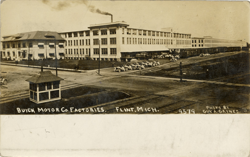 Favorite this☆ Buick Motor Company factory, Flint, Michigan Description: View of the Buick Motor Company factory in Flint, Michigan. Printed on front: "Buick Motor Co. factories, Flint, Mich. 9579. Photo by Guy A. Gaines." Card is postmarked June 7, 1911. Details Resource ID: bh023506 Creator: Gaines, Guy Alonzo Subject: Automobile factories--Michigan--Flint Buick Motor Company Photographers--Michigan--Flint Photographic prints Postcards Date Issued: 1911 (year approximate) Format: 1 postcard ; 3.5 x 5.5 in. Member of: Burton Historical Collection Filing Location: M/Localities-Flint Rights: Physical rights are retained by DPL. Copyright is retained in accordance with U.S. copyright laws.