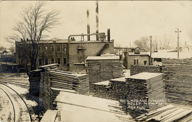 View of the Michigan Manufacturing and Lumber Co. factory in Holly, Michigan. Stacks of lumber in foreground. Printed on front: "Mich. Mfg. and Lumber Co., Holly, Mich. R.G.H. photo."