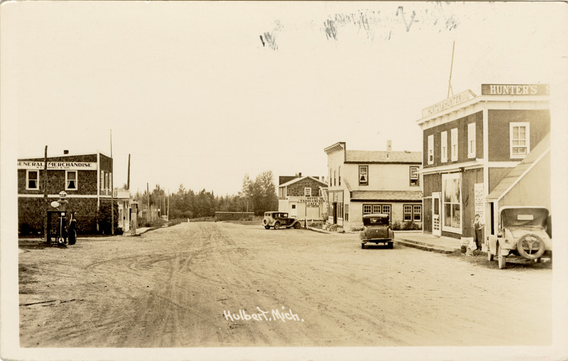 View of commercial buildings on an unidentified street in Hulbert, Michigan. Printed on front: "Hulbert, Mich." Handwritten on back: "Stayed in this town Mon. night. 7-24-39."