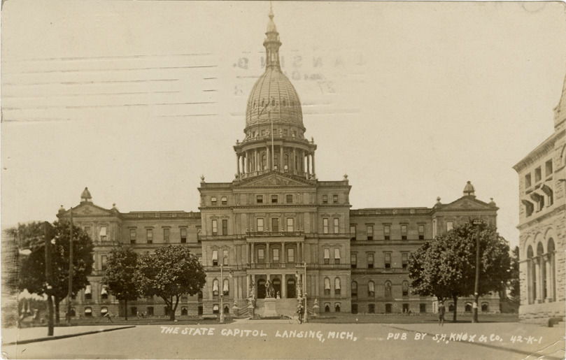 Favorite this☆ Michigan State Capitol, Lansing, Michigan Description: View of the Michigan State Capitol building in Lansing, Michigan. Printed on front: "The State Capitol, Lansing, Mich. Pub. by S.H. Knox & co." Details Resource ID: bh023582 Subject: Michigan State Capitol (Lansing, Mich.) Photographic prints Postcards Publisher: S.H. Knox & Co. Date Issued: Unknown year Format: 1 postcard ; 3.5 x 5.5 in. Member of: Burton Historical Collection Clarence Faber Collection Filing Location: M/Localities-Lansing Rights: Physical rights are retained by DPL. Copyright is retained in accordance with U.S. copyright laws.