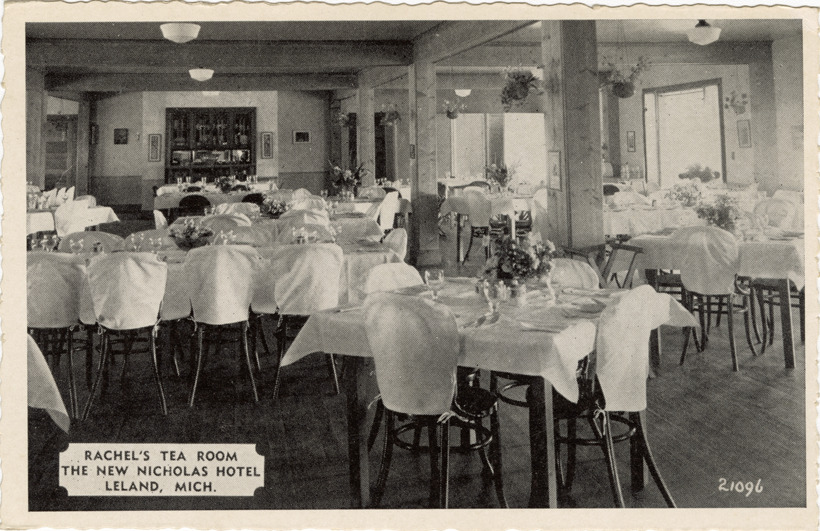 View of Rachel's Tea Room at the New Nicholas Hotel, Leland, Michigan. Dining room is furnished with tables and chairs. Printed on front: "Rachel's Tea Room, the New Nicholas Hotel, Leland, Mich." Printed on back: "The New Nicholas. (Take thine ease; eat, drink and be merry). Golf, fishing, tennis, bathing. You should never pass through without eating at Rachel's Tea Room. We will be glad to send detailed information. F.P. Rosman, Leland, Mich. In Michigan's beautiful Leelanau Peninsula, reached over scenic highway M-22. Home Service Studios, Manistee, Mich."