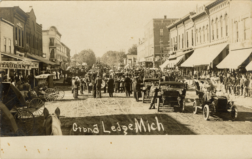View of a crowd gathered on an unidentified street in Grand Ledge, Michigan, possibly for an event. Cars and band in foreground; commercial buildings in background. Printed on front: "Grand Ledge, Mich."