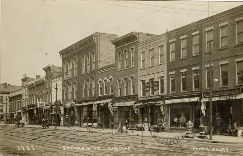 View of commercial buildings on Saginaw St. in Pontiac, Michigan. Printed on front: "Saginaw St., Pontiac. Pesha, photo." Printed on back: "A photograph mounted 16 x 20 like this photo $1.00 prepaid. L. Pesha, Marine City, Mich." Handwritten on back: "Flint, Mich. July 5, 1910. My dear mother in law, I am in Flint will drop you a few lines to let you know we are well. We changed our mind about going to Canada and came not here untill [sic] the July excursion [undecipherable]. We will be in Pontiac again Saturday of this week. We are having a nice time. Hope you are all well. Write to me to the general delivery Pontiac. Lots of love to all [undecipherable]." Card is postmarked July 6, 1910.