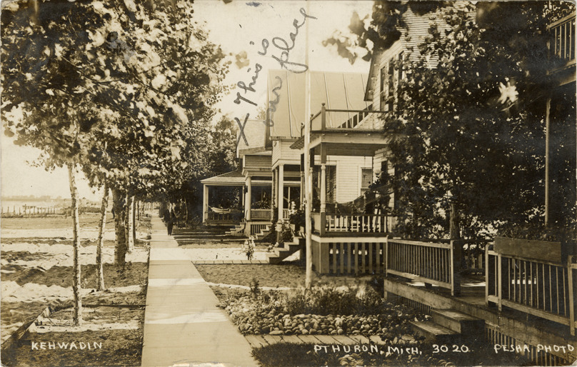 View of wooden-frame summer cottages at Keewahdin in Port Huron, Michigan. Printed on front: "Kehwadin [sic], Pt. Huron, Mich. Pesha, photo." Handwritten on back: "8-21-12. Am here for a few days. It's great. Suppose you are again settled down in Goshen. Ray."