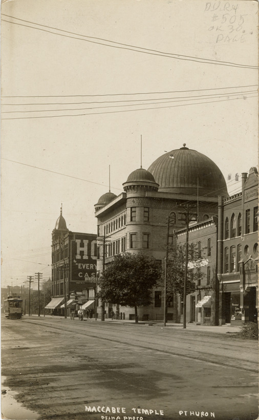 View of the Maccabees Temple in Port Huron, Michigan. Printed on front: "Maccabee [sic] Temple, Pt. Huron. Pesha, photo." Handwritten on back: "Dear Friend, have forgotten whether or not I returned your card. Took my exam yesterday. Found some of it quite hard. Children's Day exercises I understand are to be week from Sunday. E.C.D." Card is postmarked June 19, 1909.