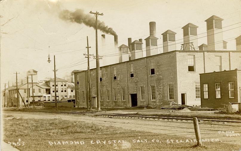 View of the Diamond Crystal Salt Company factory in St. Clair, Michigan. Printed on front: "Diamond Crystal Salt Co., St. Clair, Mich. Pesha, photo." Handwritten on back: "Dec. 14, 1934. Dear John, I am haven [sic] a good time down hear [sic]. Work from 5 p.m. to 1 a.m. out in the [undecipherable]." Card is postmarked December 14, 1934.