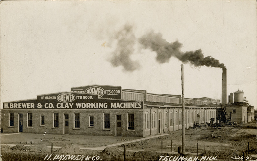 View of the H. Brewer & Co. factory in Tecumseh, Michigan. Painted on building: "H.Brewer & Co. clay working machines. If marked Brewer, it's good." Printed on front: "H. Brewer & Co., Tecumseh, Mich." Printed on back: "Photo by Bryan Post Card Co., Bryan, O."