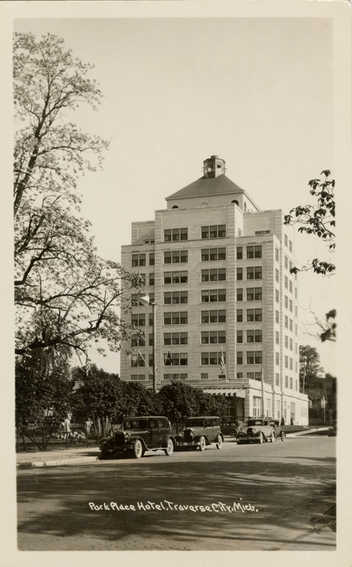 Favorite this☆ Park Place Hotel, Traverse City, Michigan Description: View of the Park Place Hotel in Traverse City, Michigan. Cars are parked in street. Printed on front: "Park Place Hotel, Traverse City, Mich." Details Resource ID: bh023748 Subject: Hotels--Michigan--Traverse City Automobiles--Michigan--Traverse City Photographic prints Postcards Date Issued: Unknown year Format: 1 postcard ; 5.5 x 3.5 in. Member of: Burton Historical Collection Filing Location: M/Localities-Traverse City Rights: Physical rights are retained by DPL. Copyright is retained in accordance with U.S. copyright laws.
