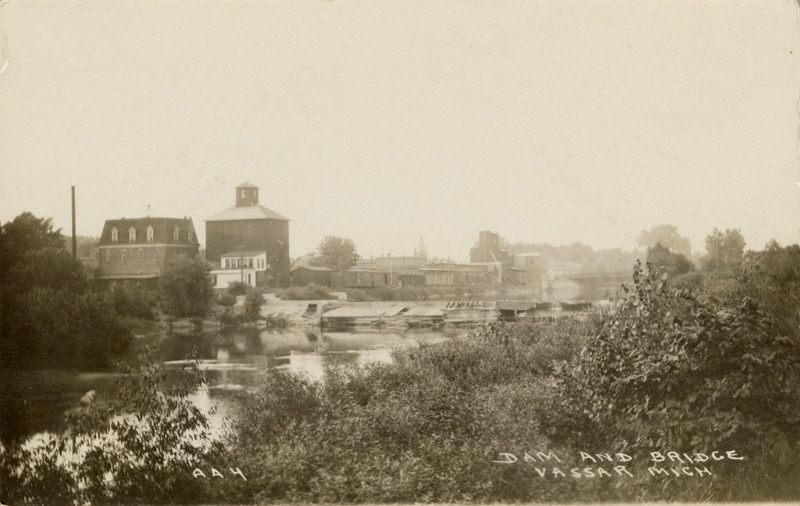 View of the dam and bridge over river in Vassar, Michigan. Reliance Milling Company in background. Printed on front: "Dam and bridge, Vassar, Mich."