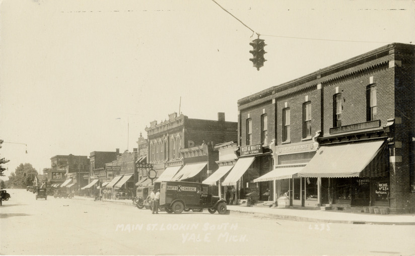 Favorite this☆ Commercial buildings on Main Street, Yale, Michigan Description: View of commercial buildings, automobiles and trucks on Main St. in Yale, Michigan. Printed on front: "Main St. looking south, Yale, Mich." Details Resource ID: bh023755 Subject: Commercial buildings--Michigan--Yale Streets--Michigan--Yale Trucks--Michigan--Yale Photographic prints Postcards Date Issued: Unknown year Format: 1 postcard ; 3.5 x 5.5 in. Member of: Burton Historical Collection Filing Location: M/Localities-Yale Rights: Physical rights are retained by DPL. Copyright is retained in accordance with U.S. copyright laws.