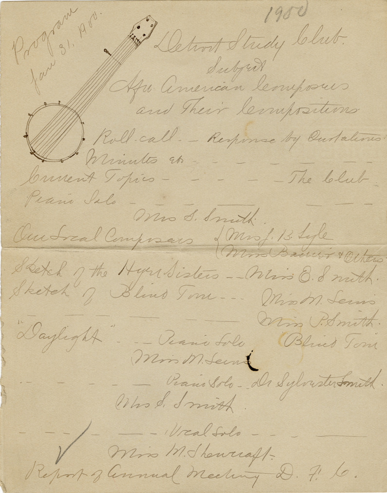 Favorite this☆ Program, Detroit Study Club, January 31, 1900 Description: Program for the Detroit Study Club held on January 31, 1900. Program has illustration of banjo. Details Resource ID: bh023765 Subject: Detroit Study Club Musical instruments in art African American women--Societies and clubs Detroit Study Club--Archives Programs Date Issued: 1900-01-31 Format: 1 program ; 6.75 x 5.25 in. Member of: Burton Historical Collection Filing Location: MS/Detroit Study Club, 2:4 Rights: Physical rights are retained by DPL. Copyright is retained in accordance with U.S. copyright laws.
