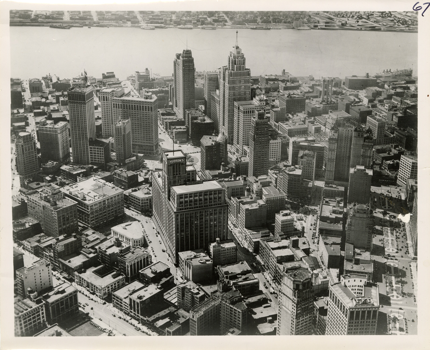 Favorite this☆ Aerial view of J.L. Hudson Company building Description: Bird's-eye view of the J.L. Hudson Company building and department store and other buildings in downtown Detroit. Details Resource ID: bh023773 Subject: J.L. Hudson Company Department stores--Michigan--Detroit Detroit (Mich.)--Aerial views Photographic prints Date Issued: Unknown year Format: 1 photographic print ; 8 x 10 in. Member of: Burton Historical Collection Filing Location: D/Industries and business houses-Hudson (J.L.) Rights: Physical rights are retained by DPL. Copyright is retained in accordance with U.S. copyright laws.