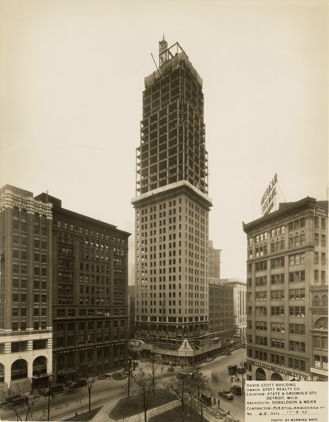 View of the David Stott Building during construction, showing structural framework on upper levels. Detroit Savings Bank and American State Bank in foreground. The Stott Building was designed by Donaldson and Meier. Printed on front: "David Stott Building. Owner: Stott Realty Co. Location: State & Griswold Sts. Detroit, Mich. Architects: Donaldson & Meier. Contractor: Martin-Krausmann Co. No. 68. Date: 11-9-28. Photo by Manning Bros."