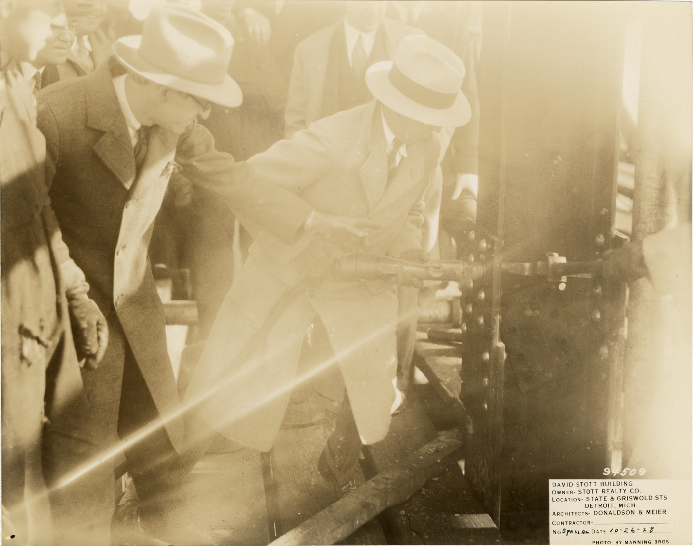 View of a man, wearing an overcoat and hat, bolting a girder on the David Stott Building during construction. Other men stand nearby. The Stott Building was designed by Donaldson and Meier. Printed on front: "David Stott Building. Owner: Stott Realty Co. Location: State & Griswold Sts. Detroit, Mich. Architects: Donaldson & Meier. Contractor: Martin-Krausmann Co. No. Special. Date: 10-26-28. Photo by Manning Bros."